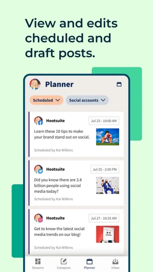 Upload photos, videos, and GIFs directly from your phone. Create and schedule posts to all your Instagram (including carousels), TikTok, Facebook, LinkedIn, and Twitter profiles in advance, and publish automatically from the palm of your hand.
