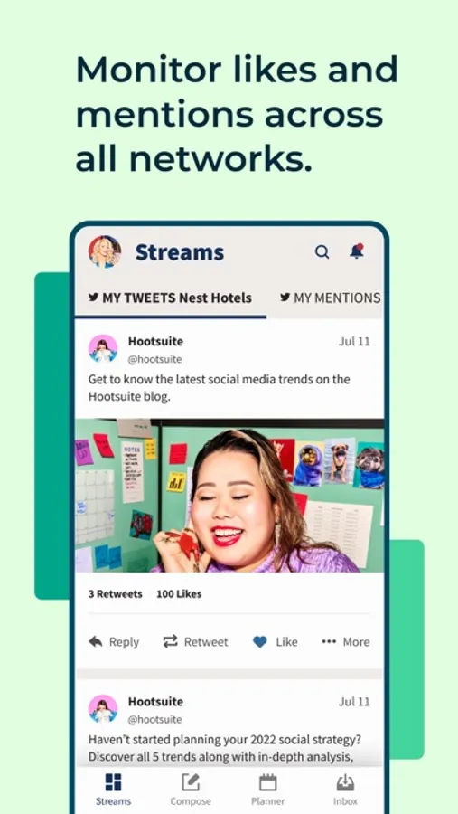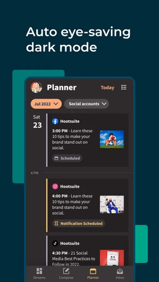 Stay connected across all your social accounts with Hootsuite! Create scroll-stopping content, schedule and publish posts, monitor activity and mentions, and manage comments and messages—anywhere, anytime, and all in one app. Plus, make those long workdays a little easier on the eyes with dark mode.