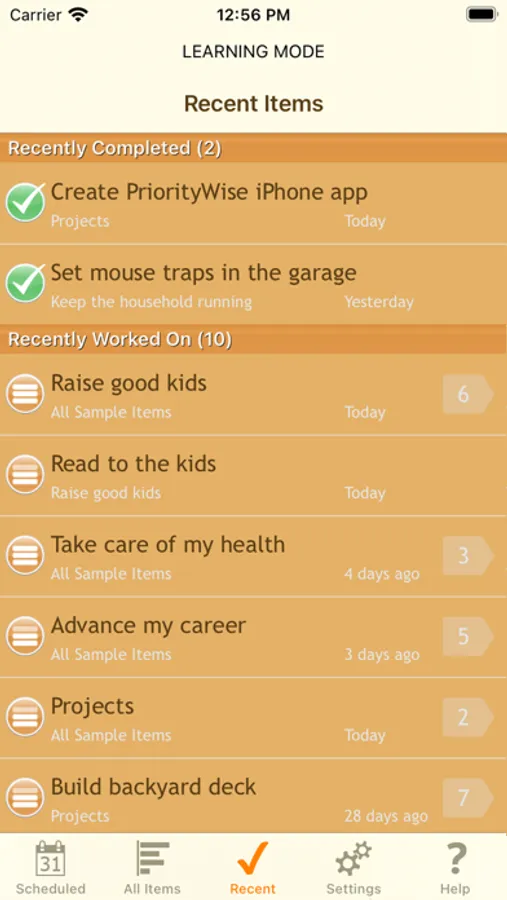• You can record when you complete an item, but you can also record whenever you work on an item. Using this information, PriorityWise shows you what areas or projects you are working on the most, which ones you may be neglecting, and how long it has been since you have worked on items in any category.