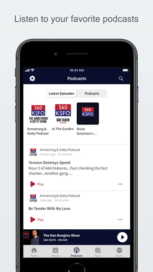 Never be without your favorite radio station. KSFO-AM is proud to present our OFFICIAL radio app.   Listen to us at work, home or on the road. Install our app and get instant access to our unique content, features and more!  - New design and interface  - See current playing show, latest podcast episodes and up to date station and local news on a single screen  - Access all your favorite podcast shows on demand.  Listen live (less storage requirement) or download and listen when offline  - Get notifications and single click access to any station promotions or contests  - View station’s YouTube channel without searching or leaving the app (when available)  - Wake up to your favorite station with our alarm clock. Record a personal reminder to play before waking to the station.  - Fall asleep while listening to your favorite station  - Access station's weekly show schedules so you don’t miss a thing  - Real-time weather for where you are  - Share our app via Facebook, Twitter, and e-mail  - Car Mode provides simple audio controls so you can listen while on the road