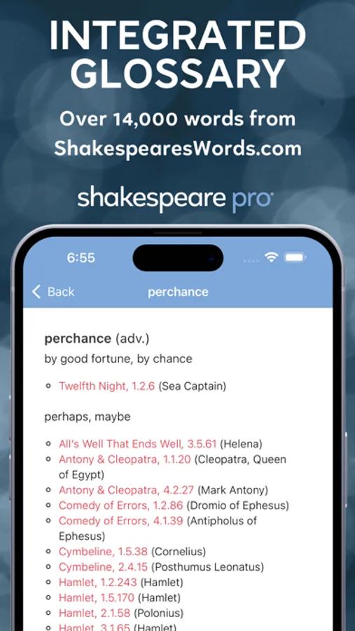 ••• AN INTEGRATED GLOSSARY, based on the bestselling lexicon by David & Ben Crystal, Shakespeare’s Words™ is included. Simply tapping on a word will display its definition in context (not just a general definition).
