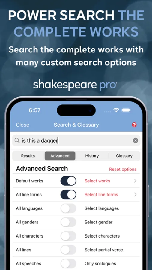 ••• POWER SEARCH THE WORKS by customizing multiple parameters like gender, genre, work, language, line form, soliloquies, and more.