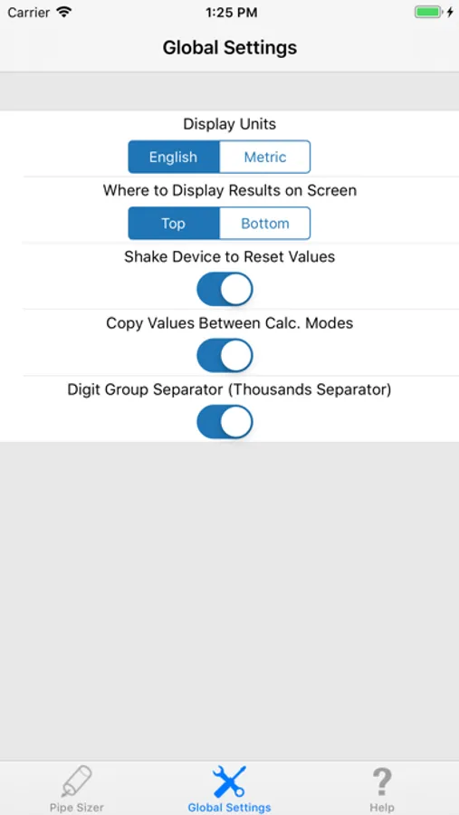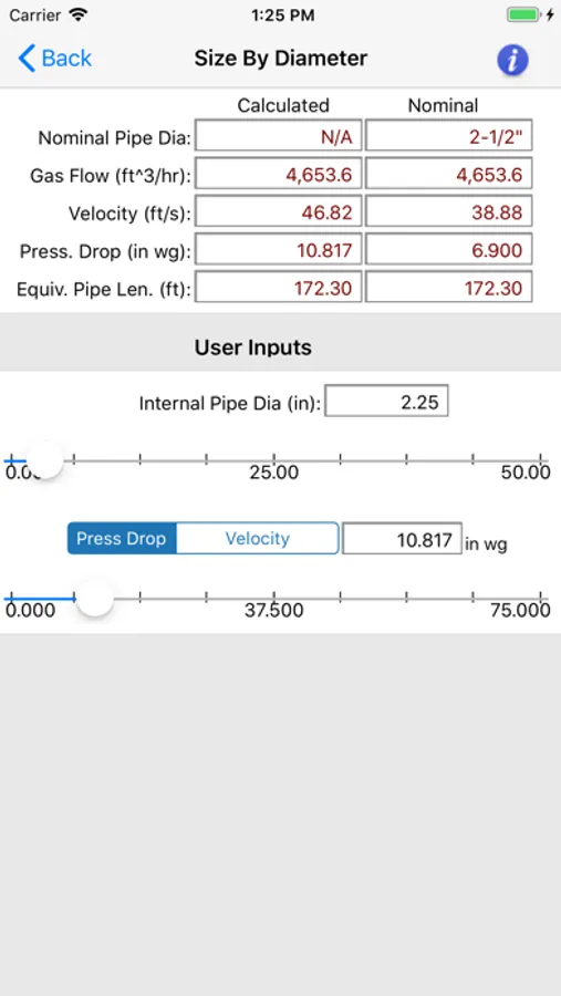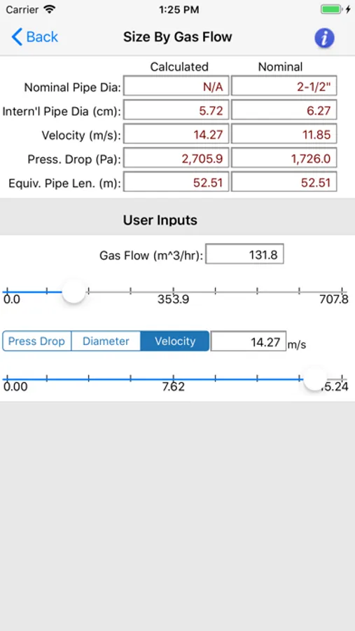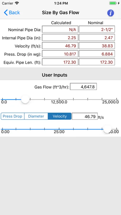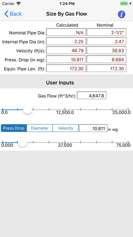 The "HVAC Pipe Sizer - Gas Low" application uses slider controls that allow you to quickly increment or decrement the input values and immediately observe the calculated results. You can also manually input exact values.