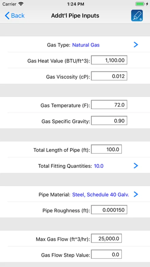 You can specify additional parameters such as the type of gas, various properties of the gas, the pipe material type, the total length of pipe, quantities for up to 11 different types of pipe fittings, and much more. You can also choose to display values in either english or metric units.