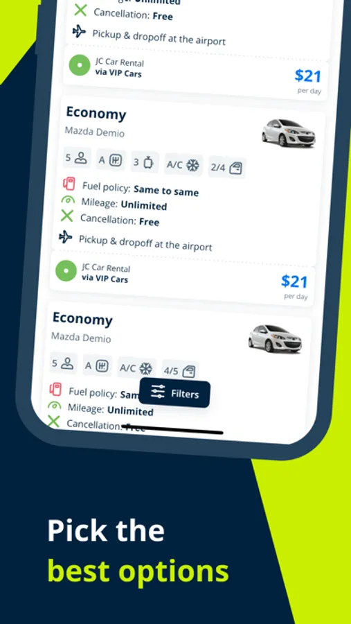 • Customize your search: pick up at the airport, train station or city center, unlimited mileage, Full to Full fuel policy, automatic or manual car, air-conditioning, etc.