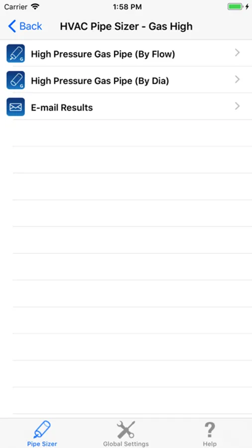 The "HVAC Pipe Sizer - Gas High" application allows you to quickly size a simple high pressure (> 1.5psi) gas piping system by inputting a number of piping and gas properties.