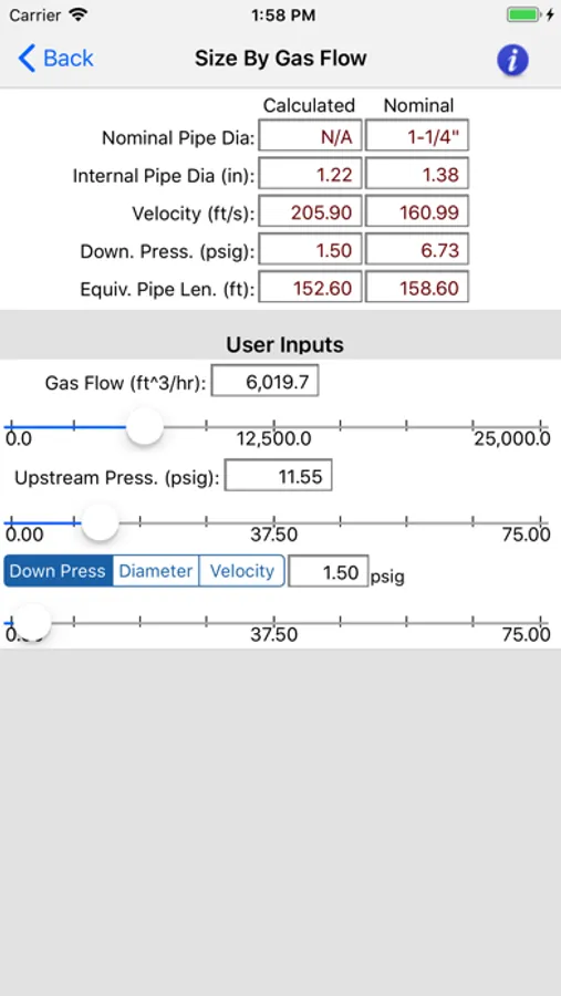You can specify the total gas flow in ft^3/hr (m^3/hr), the upstream pressure (psig or kPa), and one of either downstream pressure (psig or kPa), pipe internal diameter (inches) or gas velocity (ft/s) parameters. The results include both the exact and nominal pipe diameters and the calculated velocity and total pipe equivalent length. If you are analyzing an existing pipe system, there is an option to input the existing pipe internal diameter, the upstream pressure, and one of either downtream pressure or gas velocity parameters to derive the calculated gas flow and other remaining properties.