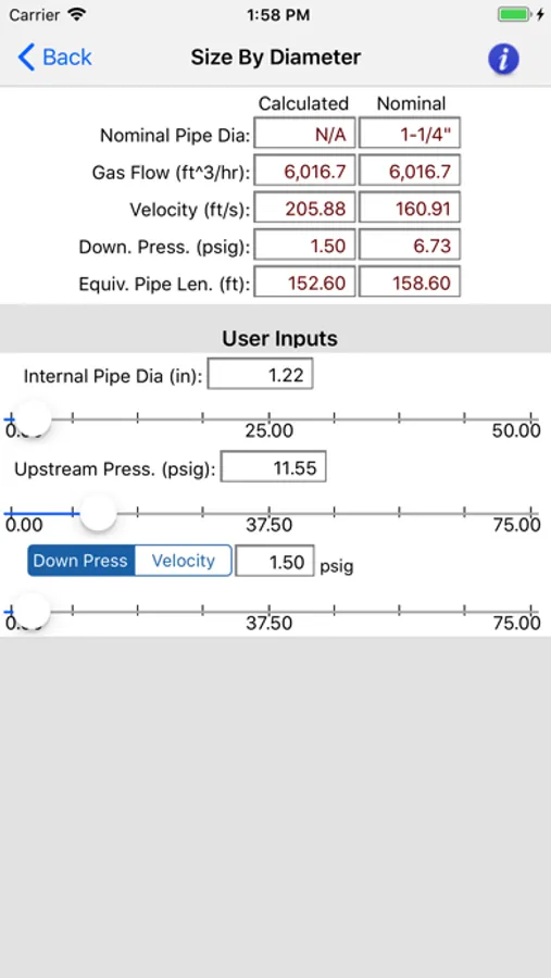 This application uses slider controls that allow you to quickly increment or decrement the input values and immediately observe the calculated results. You can also manually input exact values.