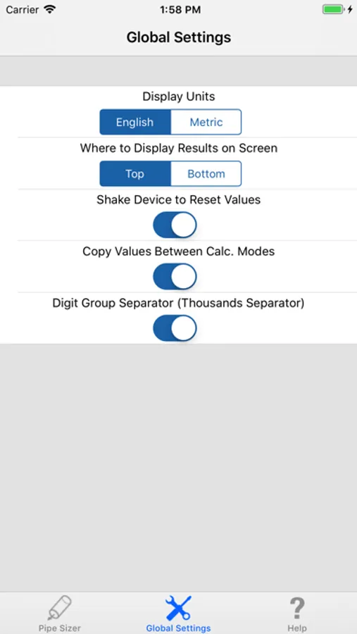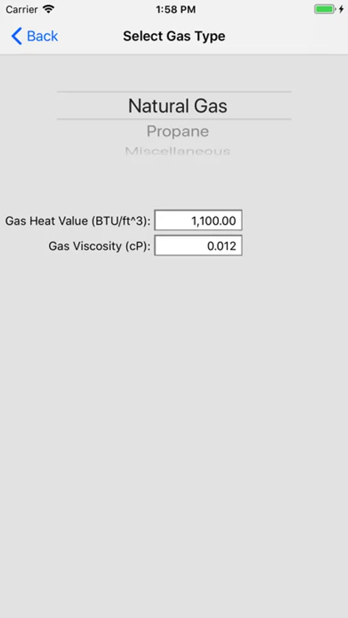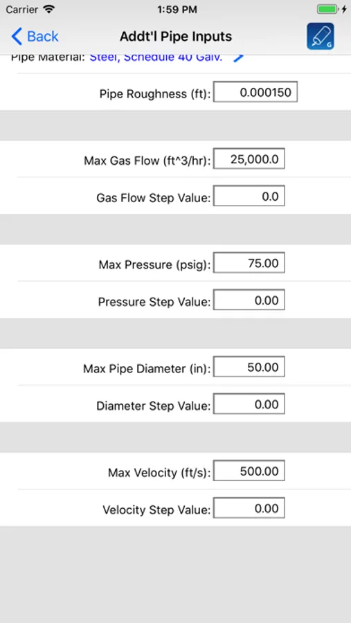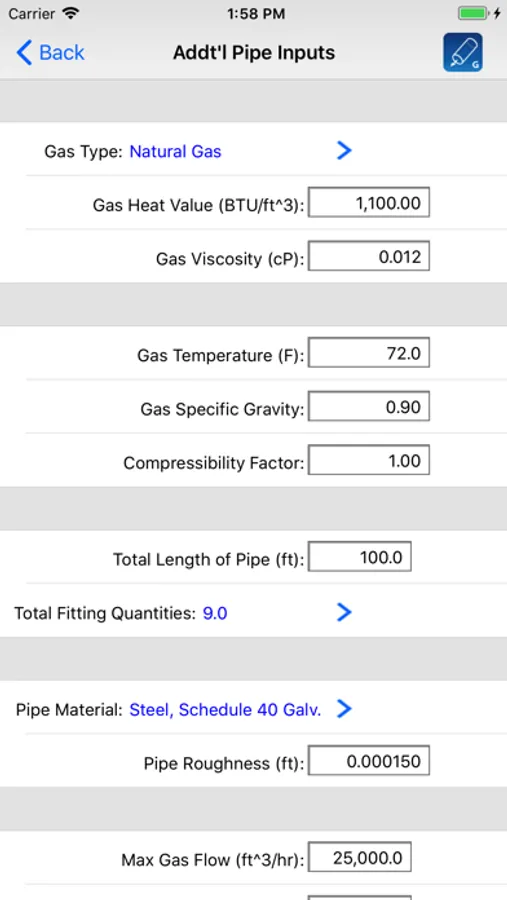You can specify additional parameters such as the type of gas, various properties of the gas, the pipe material type, the total length of pipe, quantities for up to 11 different types of pipe fittings, and much more. You can also choose to display values in either english or metric units.
