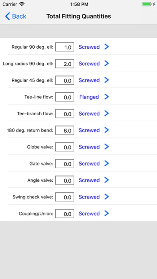 This application includes built-in pipe fitting equivalent length and nominal pipe sizing tables for a wide variety of pipe material types and diameters.