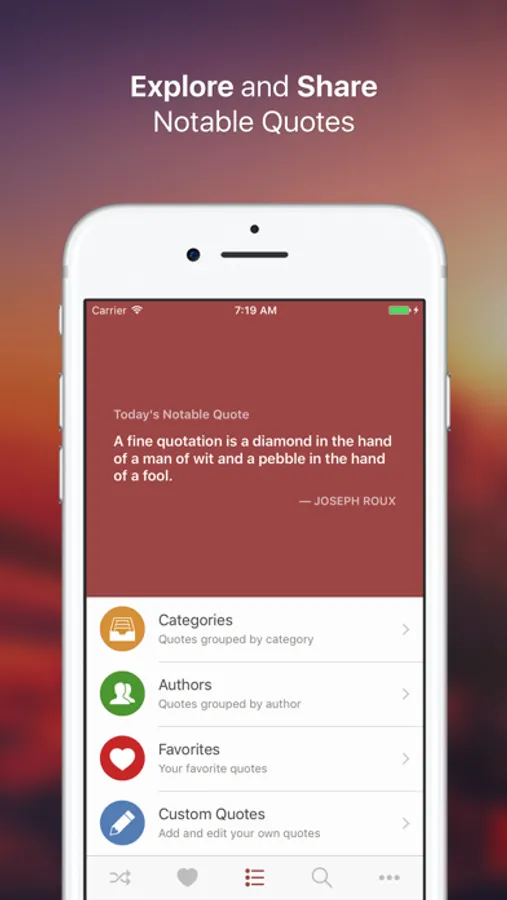 Our hand-selected quotes provide insightful and provocative food for thought. With each swipe, you will find inspirational, humorous, and comforting wisdom. A widget on your Today screen gives you a different quote every day to inspire you and make you think. Use Notable Quotes to read quotes, share them with friends, or write your own!
