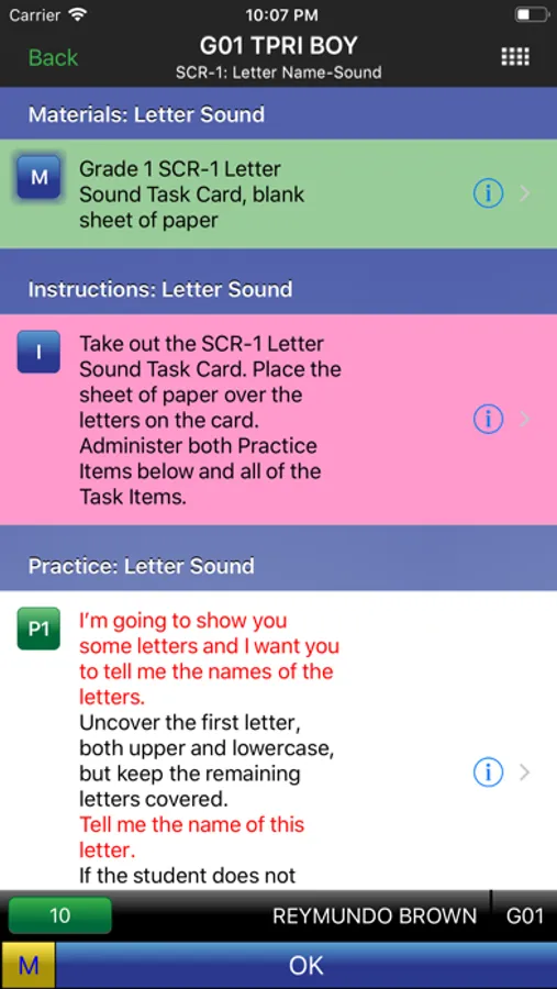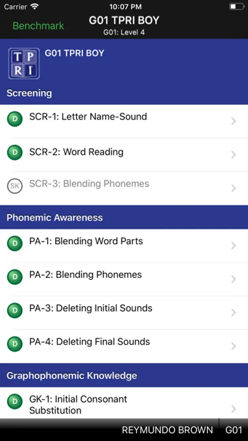 Assessment administrators simply select one of the pre-loaded students, and then select one of the recommended benchmarks or progress monitoring assessments. Tango Rx leads the teacher through the assessment tasks so that all teachers are giving the assessments in the most consistent and reliable manner.