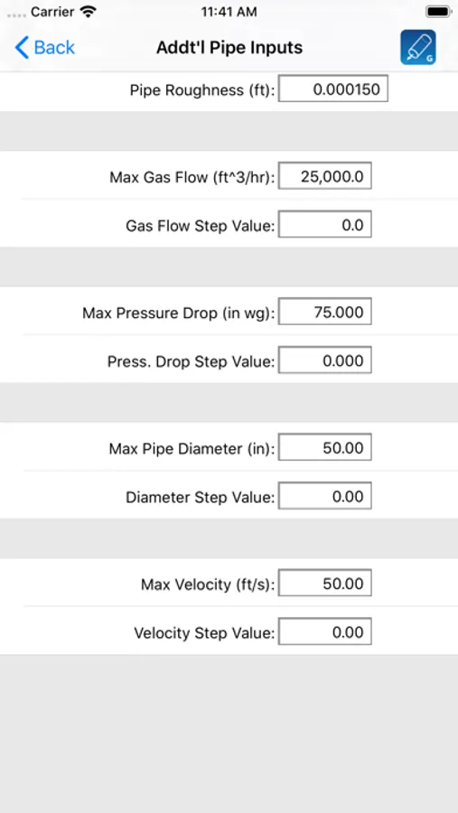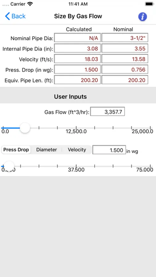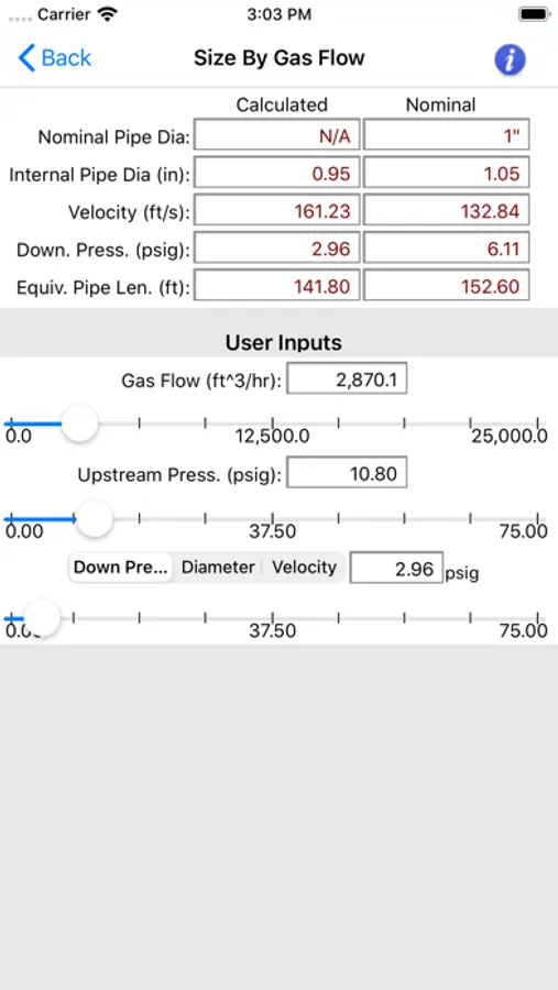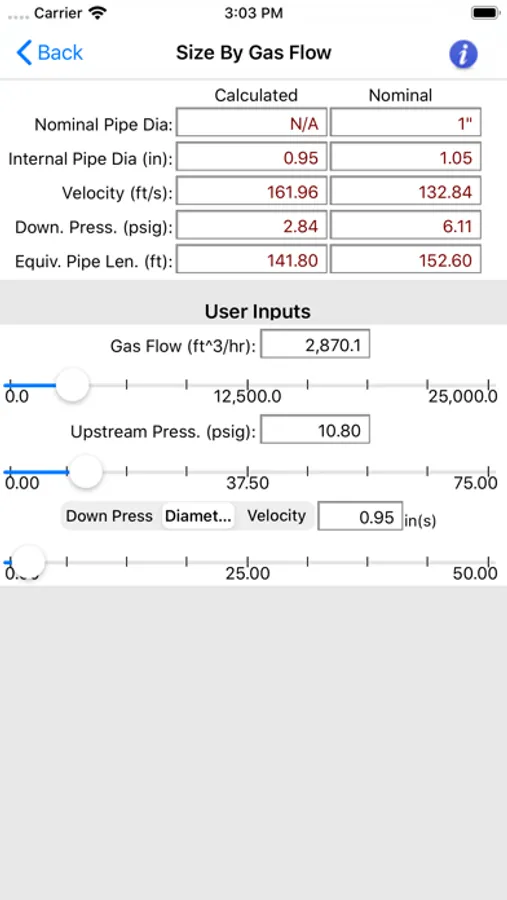 You can specify additional parameters such as the type of gas, various properties of the gas, the pipe material type, the total length of pipe, quantities for up to 11 different types of pipe fittings, and much more. You can also choose to display values in either english or metric units.