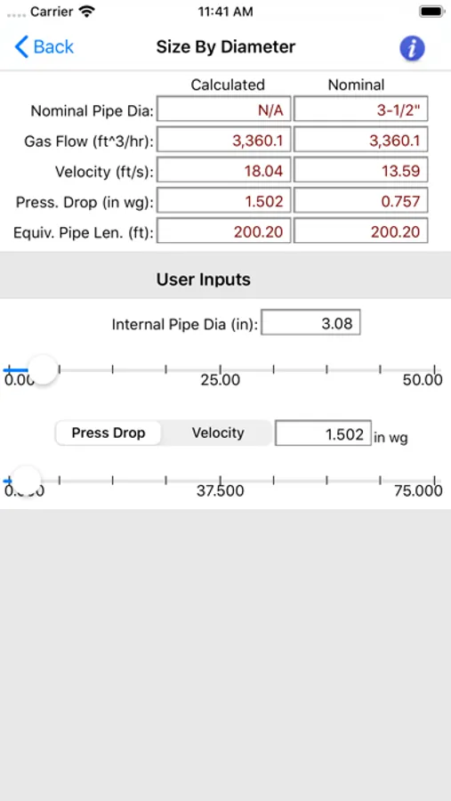 This application uses slider controls that allow you to quickly increment or decrement the input values and immediately observe the calculated results. You can also manually input exact values.