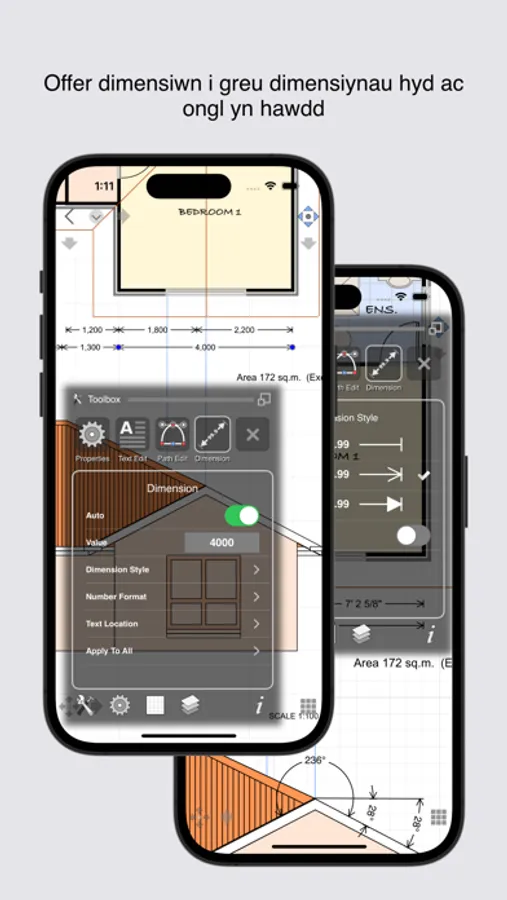 - Dimensioning tools, length as well as angular with customisable settings