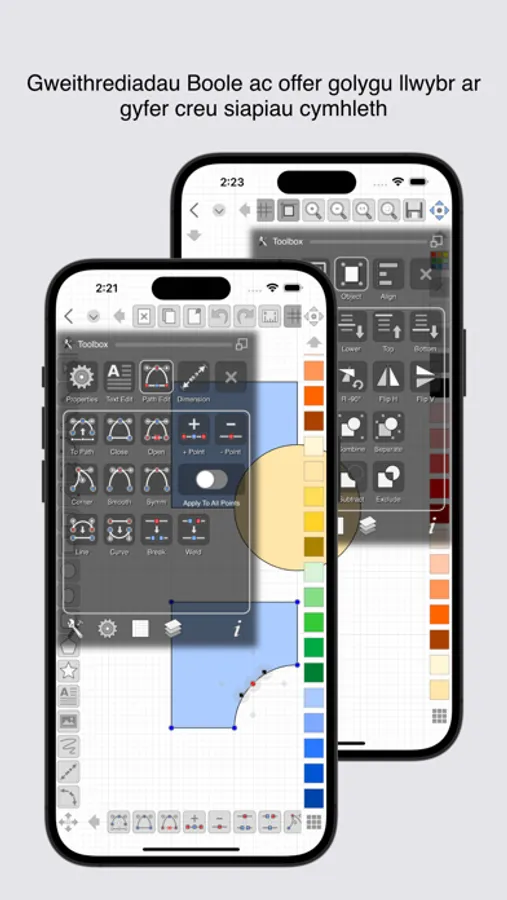 - Edit points, convert shapes to path, close shapes, add and remove points, break, weld, explode and join
