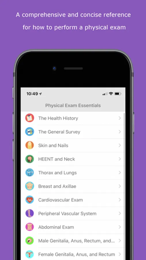 Physical Exam Essentials is not a comprehensive medical reference. Rather, it is a handy overview resource that is perfect for medical students, pre-meds, health professionals and anyone who practices or has an interest in medicine. Conveniently located on your iPhone, iPod Touch or iPad, this application provides quick, easy-to-use reviews of procedures and techniques for 14 different categories: