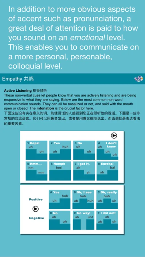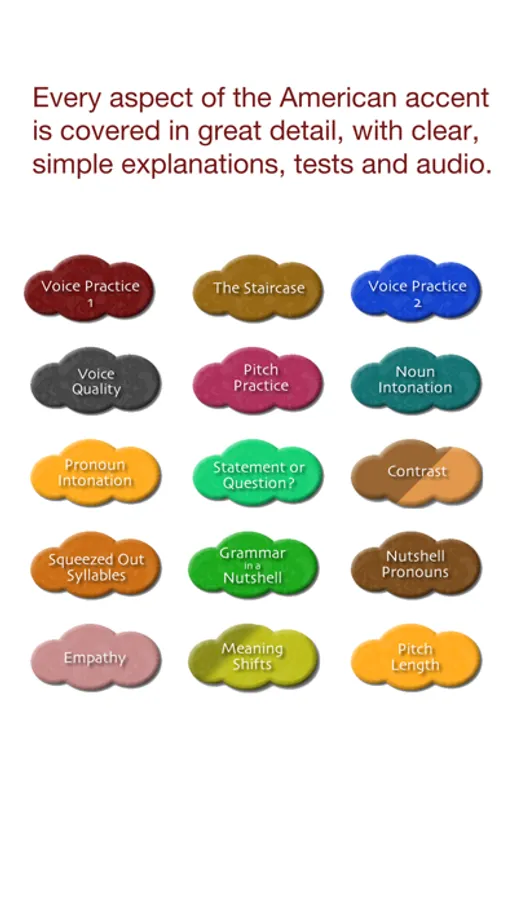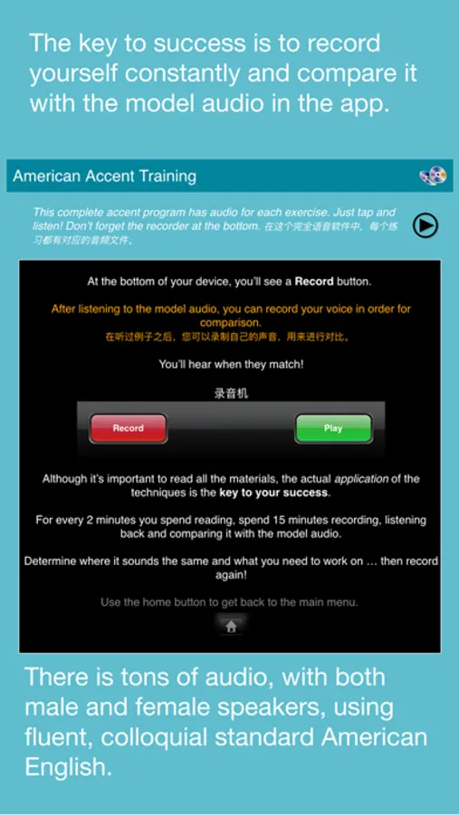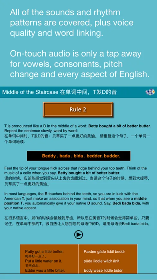 以循序渐进的方式来学习发音,词语搭配以及美式口语的韵律。您可以使用iPhone手机的耳机来听,用数码录音机来录音,并且将您自己的发音与标准音频进行对比。