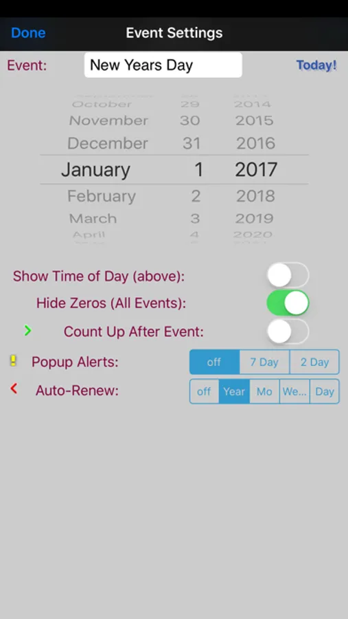 T-Minus Events will even pop up reminders for you when your event gets near, like an anniversary or birthday. And you can set an event to automatically renew on a yearly, monthly, or weekly cycle. This is the ideal App to help you track every important event.