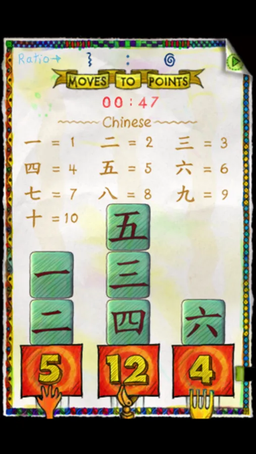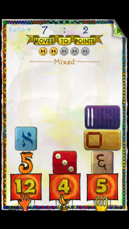 THE PUZZLE: Numerals are piled into three stacks. Each stack is randomly assigned a target sum. Move numerals and sets of numerals around with the tip of your finger from stack to stack until the sums of each stack equal the target sums represented at the bottom of the screen. Once the stacks match the sums, the screen clears and you get another challenge. The numbers are represented in eight ways that vary in their level of abstraction: preschoolers might start with the fingers, dice or ringlets, because they can be easily counted, while older children or adults can find a challenge with coins, Roman numerals, or the word spelled in Spanish.