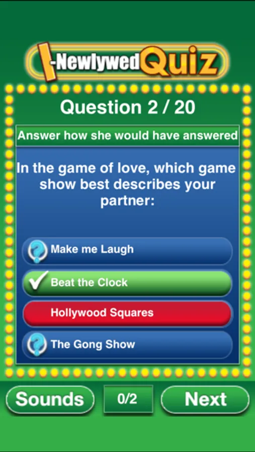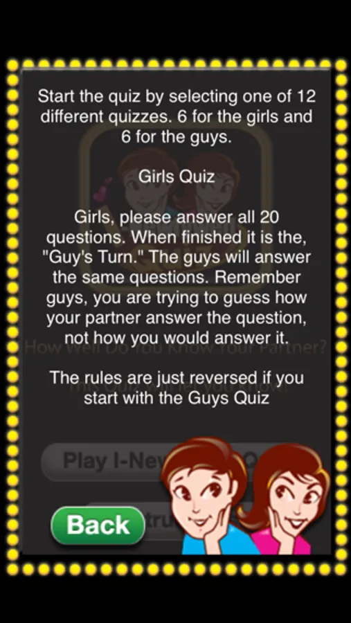 A fun, interactive quiz that any couple can take that will show just how well you know your partner. There are 12 different quizzes included with this app. Each quiz consists of 20 questions, All multiple choice. Either partner can go first. When he or she completes a quiz, They will then have their partner take the same quiz. The partner must answer the questions the way he or she thinks their partner answered them.