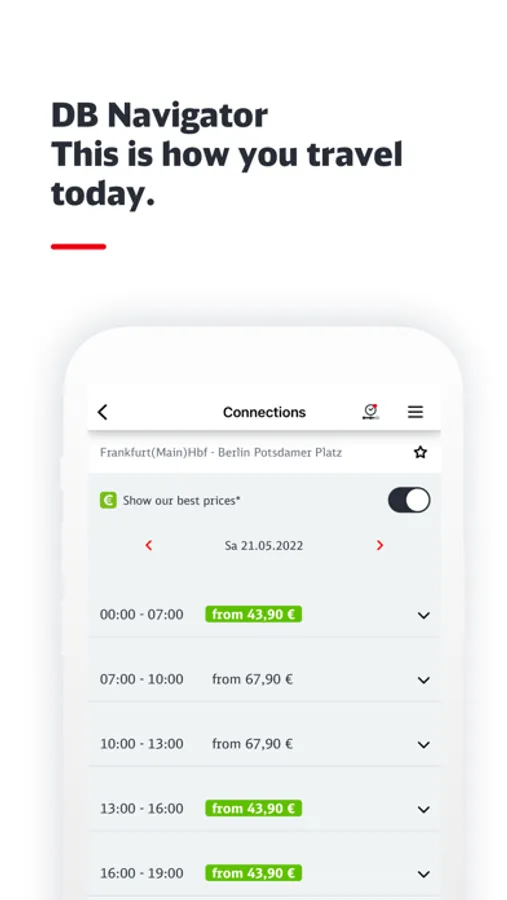 Turn your smartphone into your ticket and travel at the lowest price and without ticket controls. The DB Navigator is your perfect companion for regional and long-distance travel as well as for the underground, tram and bus. From real-time information, to the current coach sequence and notifications of changes to your journey - the DB Navigator has the right service for you in every situation.