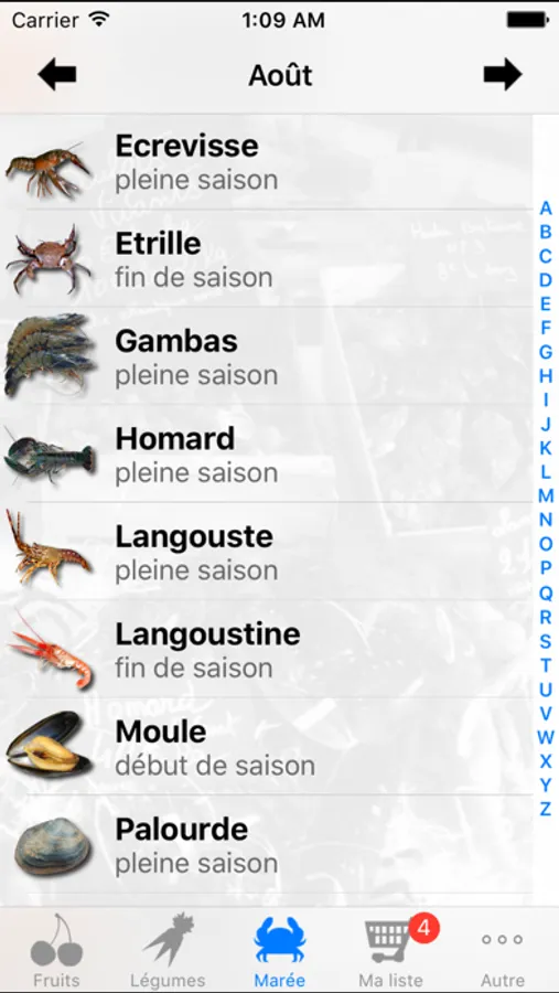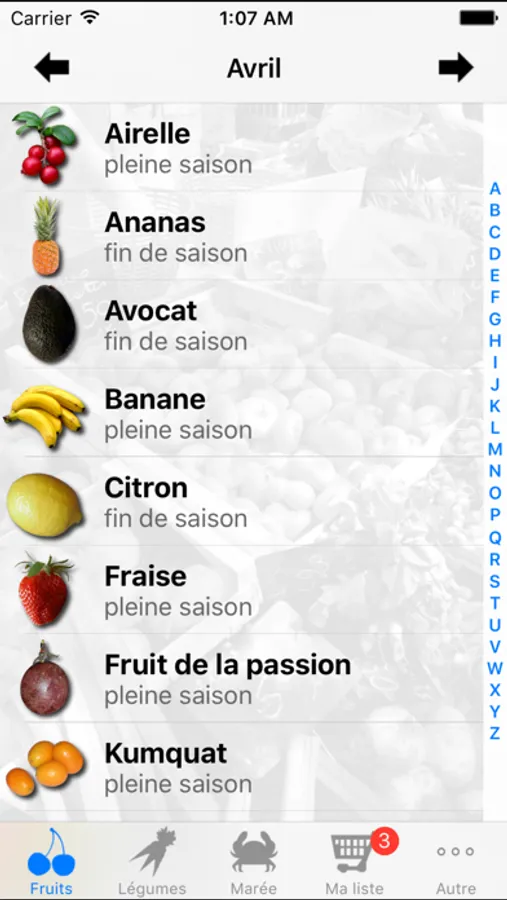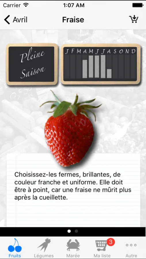 Marché Malin fournit une liste illustrée des fruits, légumes ou fruits de mer et poissons disponibles en France à la date du jour et pour chacun des mois de l’année.