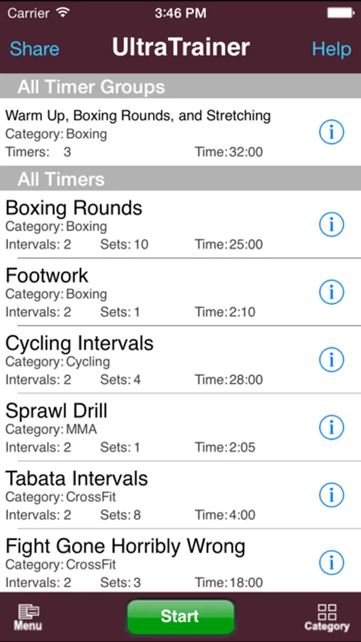For a complete workout, you can set up a Timer Group which will play individual timers back to back. Start out with your favorite Warm Up timer, then run through your favorite Training timer, and end with a Stretching timer. UltraTrainer will run you through your full workout automatically.