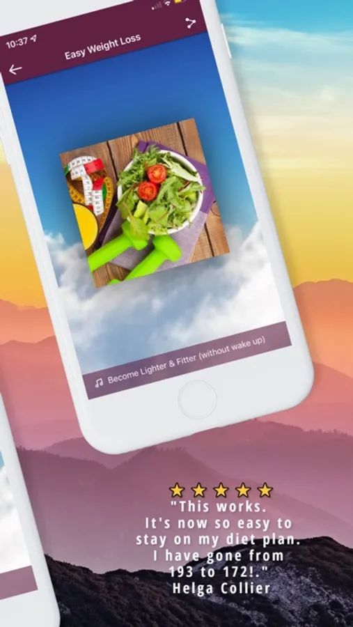 “Tried calorie counting and various diet plans but with limited success losing weight. My diet coach recommended this hypnotherapy app and it’s now become part of my regular routine, helping me manage a sensible diet and avoid all those pesky snacks! Mrs D. Johnson, Admin assistant, USA
