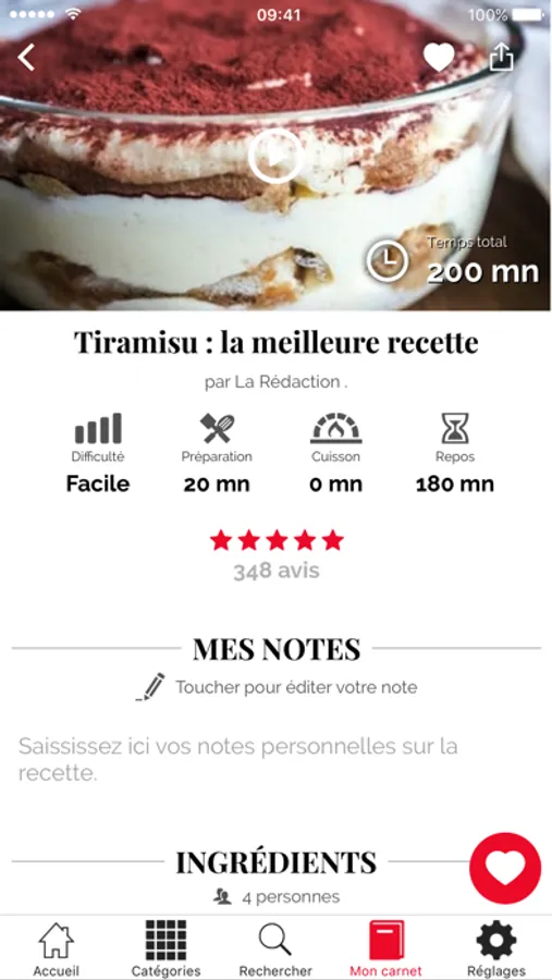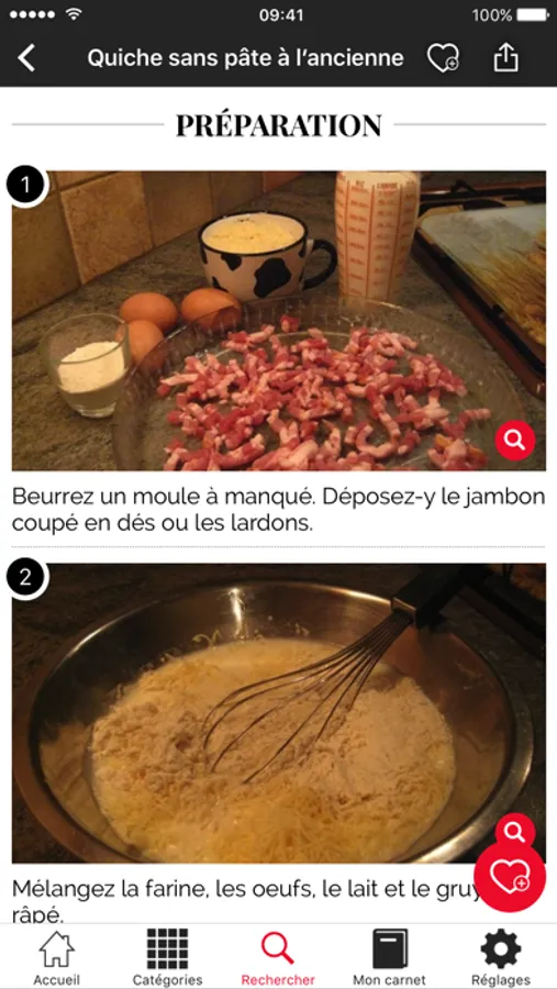 ● Ajouter en un clic vos recettes favorites à votre carnet de recettes pour les retrouver facilement dans l’application mais aussi en ligne.