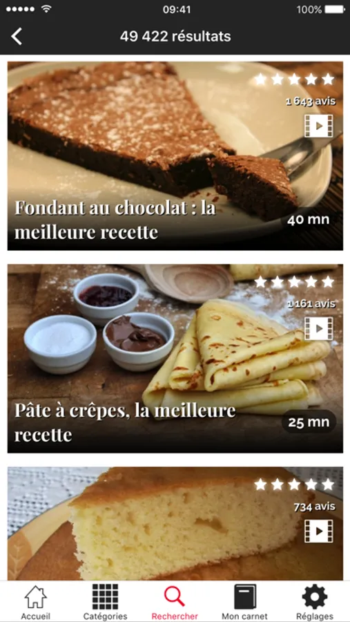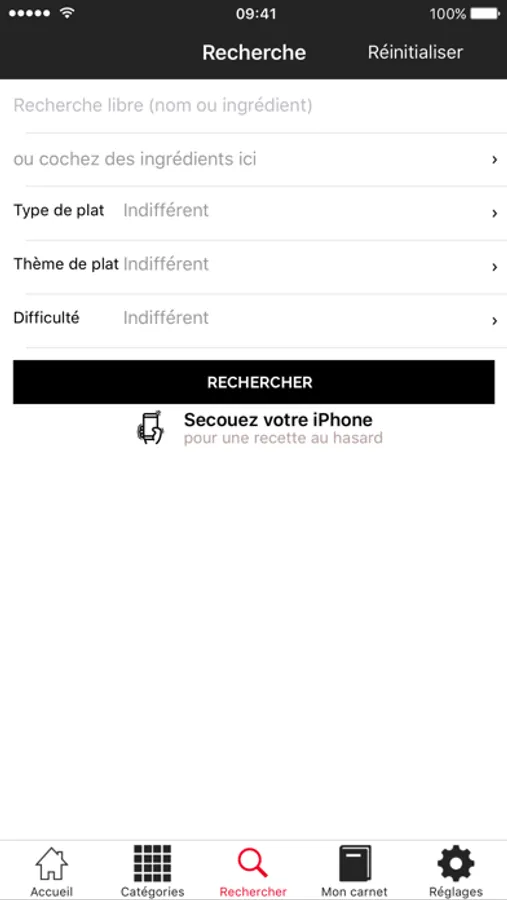 ● Rechercher des recettes par mots clés, ingrédients, types de plat, thèmes et difficultés.