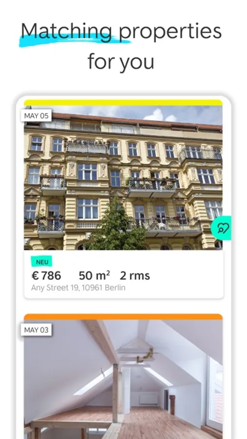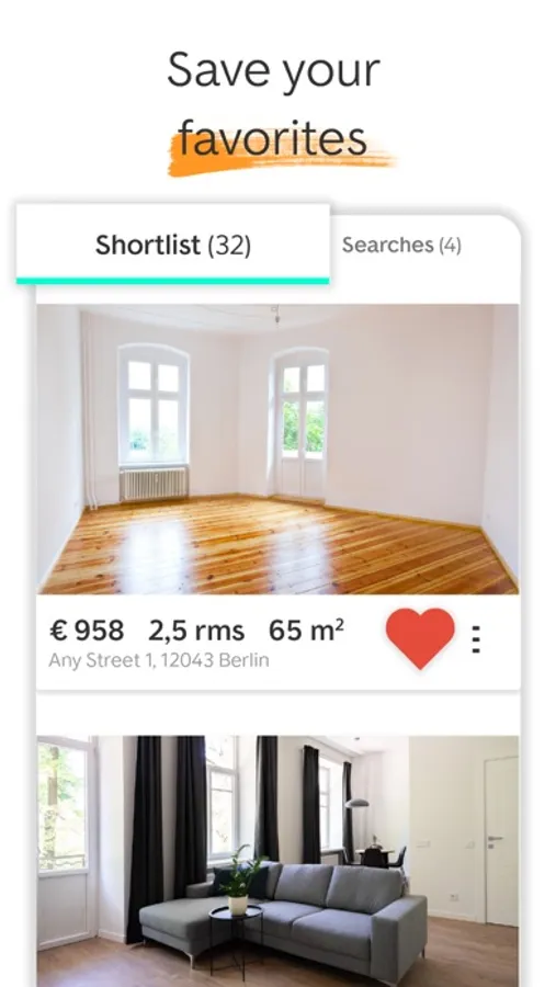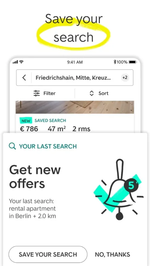 We make sure you don't miss anything. Just save your search and as soon as a new property matching your search criteria is published, you will be informed via push notifications. This way you can react quickly and apply right in the app.