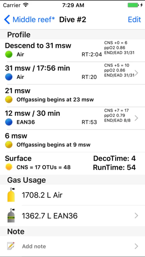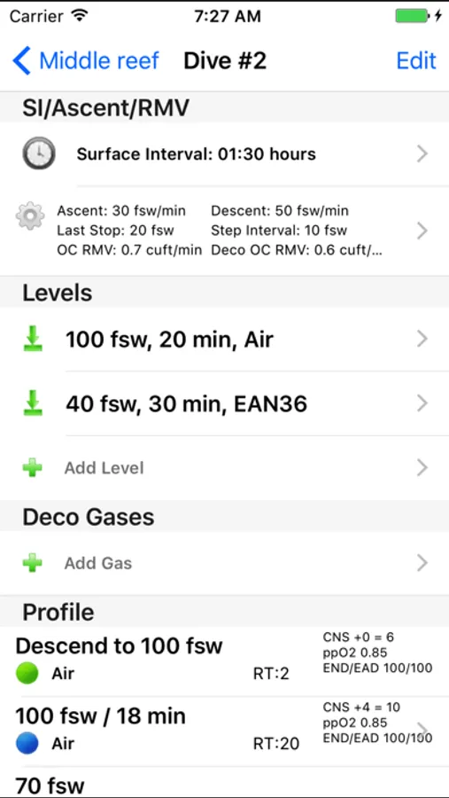 Keeps track of gas consumption, OTUs and CNS. Per dive configurable ascent/descent rates, last stop/stop interval settings and RMV/MOR.