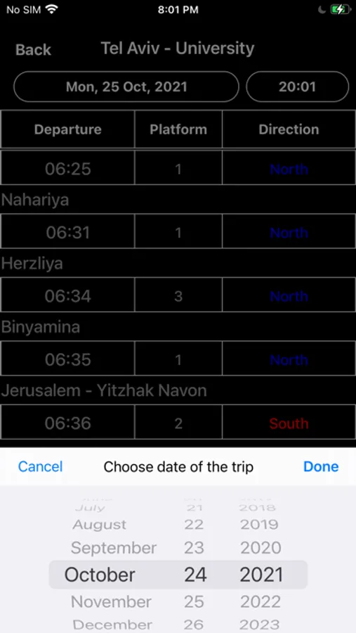 All trains info, including platform, given in order of departure (North vs. South marked in color).
