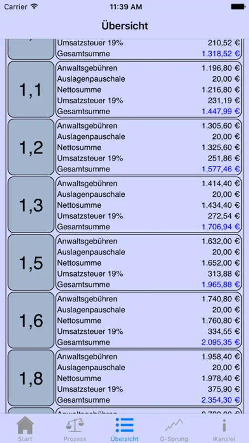 - Übersicht von Anwaltsgebühren nach den im Rechtsanwaltsvergütungsgesetz am häufigsten vorkommenden Gebührensätzen