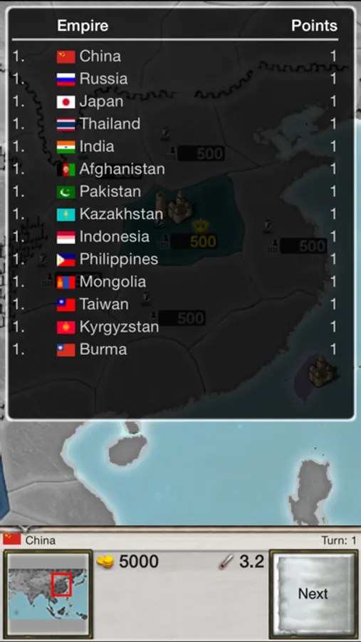 Age of Conquest ASIA is a medieval risk-like turn-based strategy game where you take the reins of a budding empire and struggle against fellow empires for control of Asia. In one game, up to 20 players vie for supremacy, but only one can be victorious. Every game you win pushes up your score, until you don't just dominate the world, but also your fellow players. Then all will be in your shadow and not just peasants, but even kings will worship you! All this can be yours, but only if you triumph.