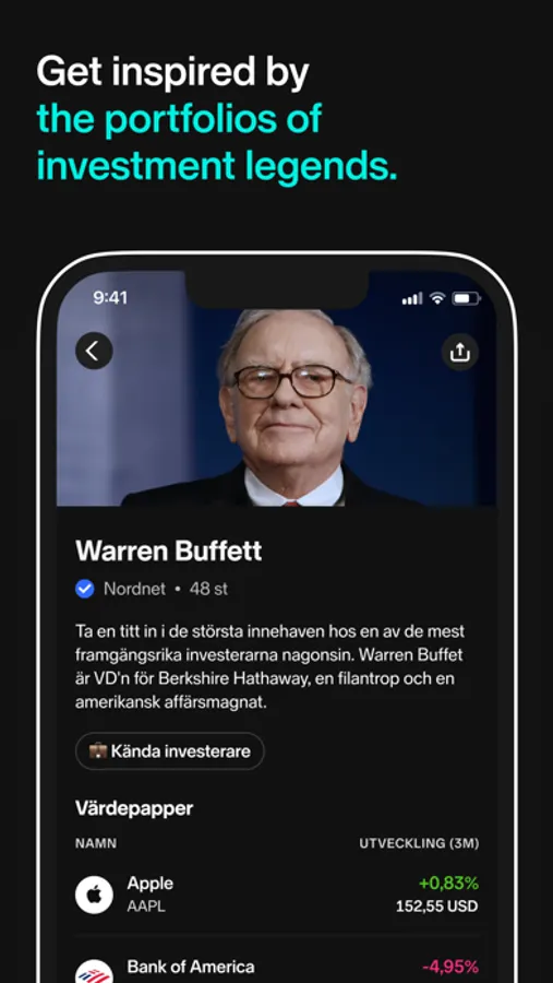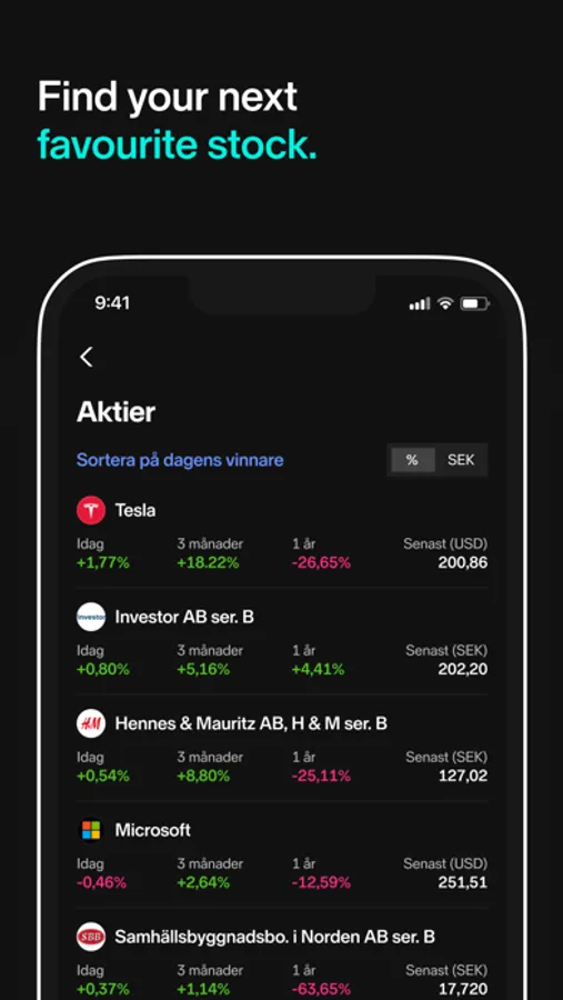 Choose from thousands of stocks and funds on multiple exchanges around the world. Get inspired by other investors' stock holdings or choose funds based on your savings goals: sustainable, low fees, or highest returns.