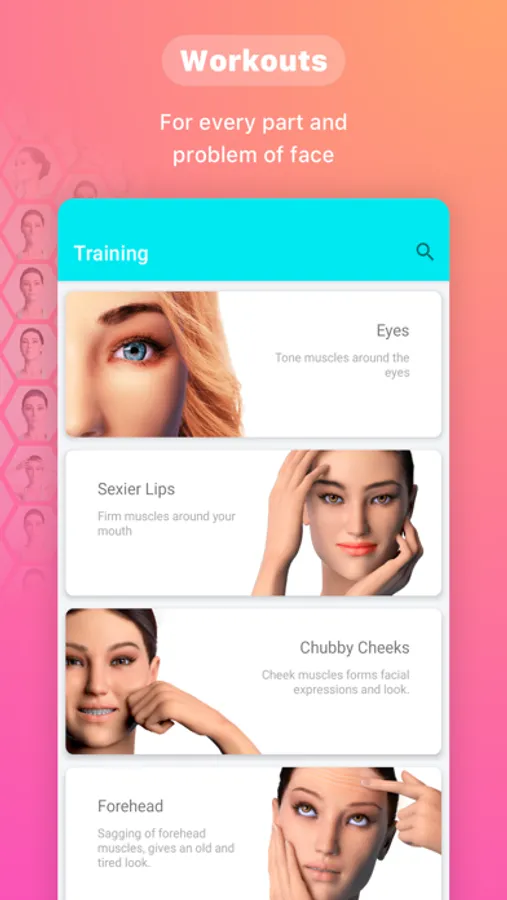 * For easy learning, the exercises are grouped by the part of the face and by the problems of the face: