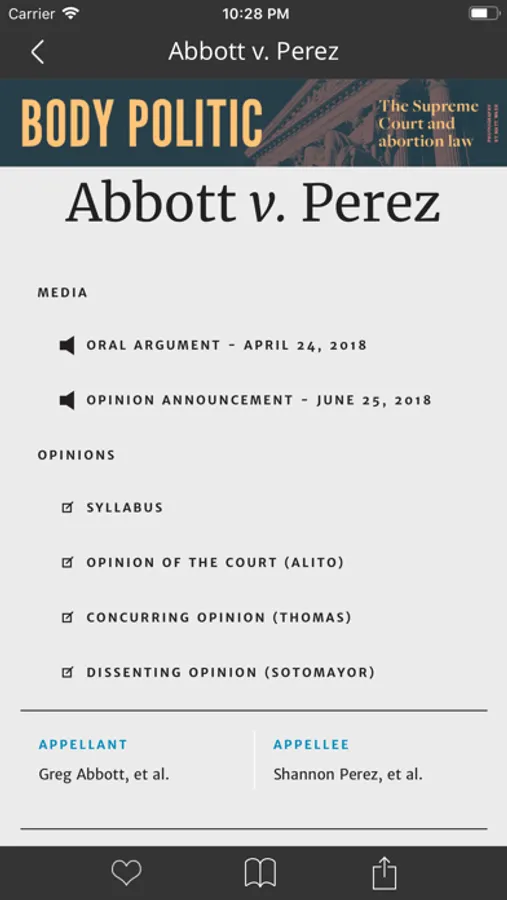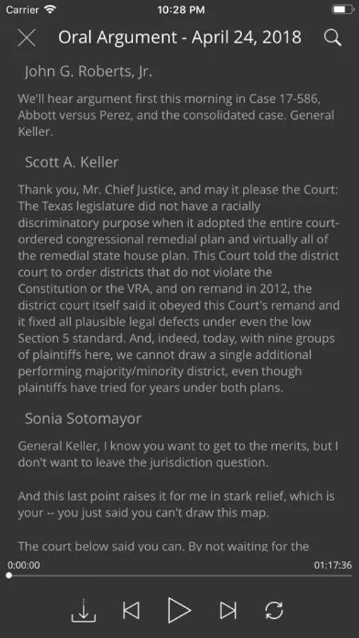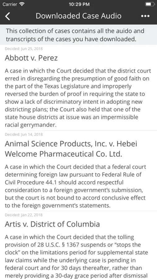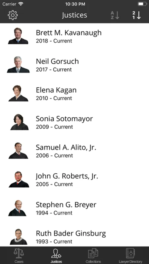 -- Oyez provides all the information available on the Oyez website plus the Justia Lawyer Directory & Annotated US Constitution in a conveniently package form for mobile users.