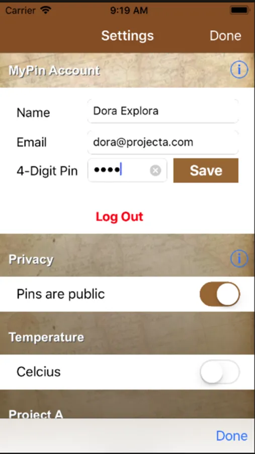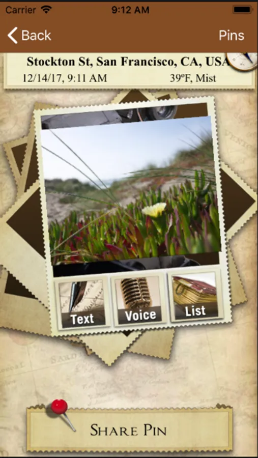 • Creates and stores any number of pins containing photo, text, sound, with auto-date, location, and weather.