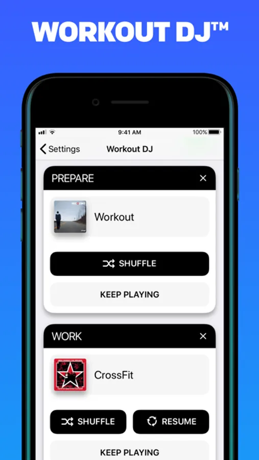 Tabata Pro has complete music control using Workout DJ. Workout DJ automatically starts and changes the music during your timer session. You can choose different music for each interval of your workout.