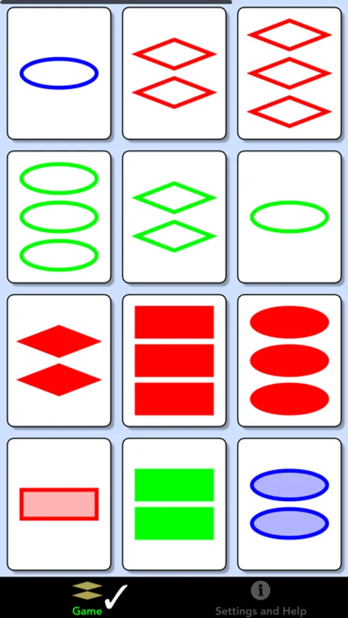 The game supposes a deck of cards, where each card has four attributes, and each attribute on any given card has one of three possible values: Number (one, two, or three), Color (red, blue, or green), Fill (solid, hazy, or empty), and Shape (diamond, oval, or rectangle).