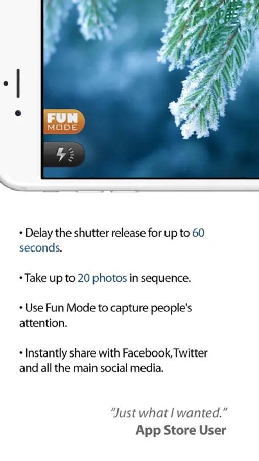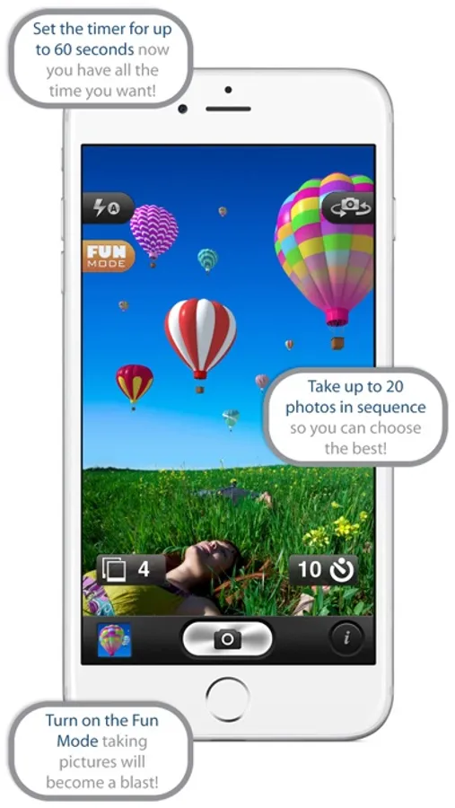 Self Timer shoots up to 20 photos in sequence with a timer that can be set up to 60 seconds.