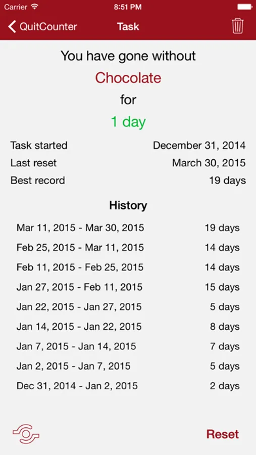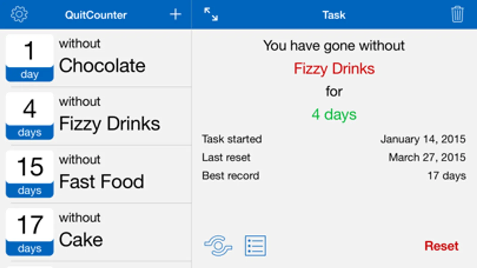 QuitCounter is an app which allows you to keep track of the things you are trying to give up. Perhaps you are refraining from chocolate biscuits? trying to give up smoking? or maybe just trying to keep to a new years resolution?