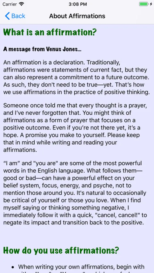 Note that this app doesn't include the audio clips from the CD (you have to buy the CD for that!), but it does include Venus's poetic affirmations for each day.