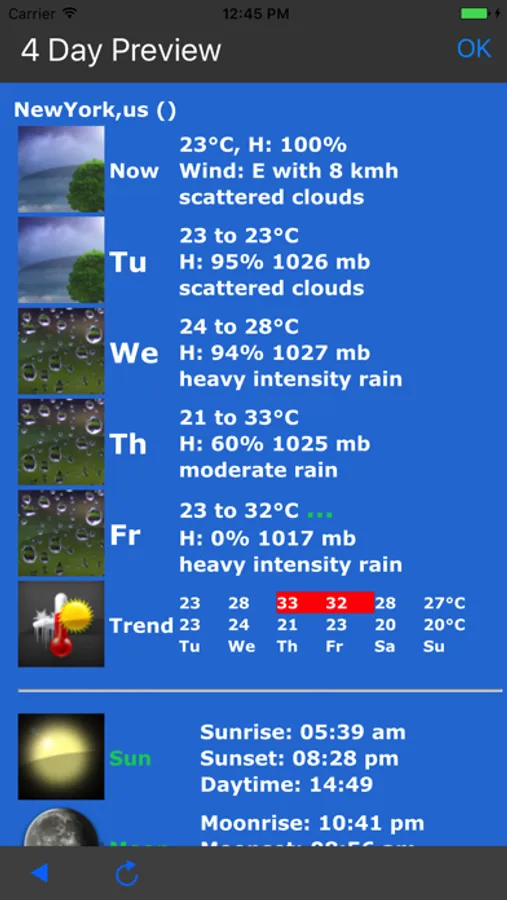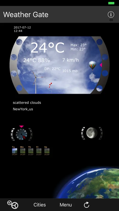 With Weather Gate you can get the weather of up to six Cities in the world. Big Temperature-Display, Felt Air Temperature, Air Humiditiy, Wind Speed, Wind Direction, Moonphases and more Values leave no wishes. A 4-days forecast.