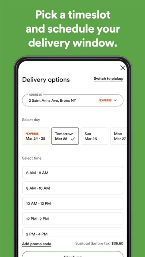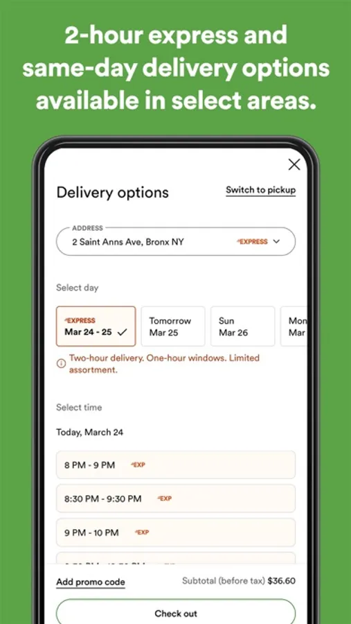 • Pick a timeslot and schedule your delivery window. 2-hour express and same-day delivery options available in select areas.