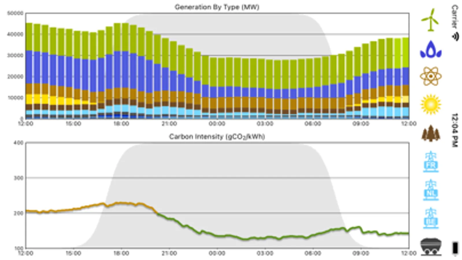 - Display of instantaneous carbon intensity (gCO2/kWh).