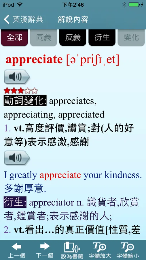2.完整內容解說,包含KK音標/解釋/例句/同義/反義/衍生/變化...等詞義。