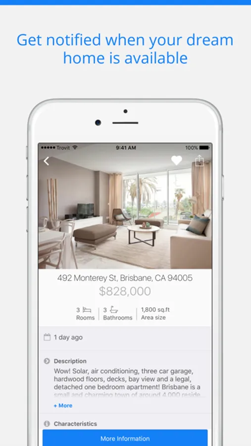 When you close the app, Trovit Homes keeps working for you. Just create an alert (or several) and we will send you a notification when there’s a new ad that matches your search criteria. We follow thousands of housing websites minute by minute so that you don’t have to. You can create as many alerts as you want to, with your ideal price, your favourite neighbourhood or the perfect combination of lots of factors.